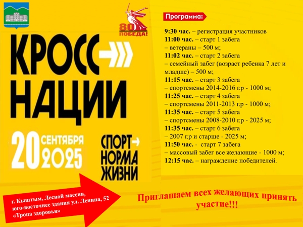 21.04.2025 Управление по физической культуре и спорту администрации Кыштымского городского округа с совместно с Центром тестирования Всероссийского физкультурно-спортивного комплекса ГТО г. Кыштыма приглашает принять участие 1 мая 2025 г. в 82-й традиционной легкоатлетической эстафете, посвященной 80-й годовщине Победы советского народа в Великой Отечественной войне и году защитника Отечества на призы газеты «Кыштымский рабочий». Начало эстафеты в 11 часов. Старт и финиш — на площади К. Маркса.